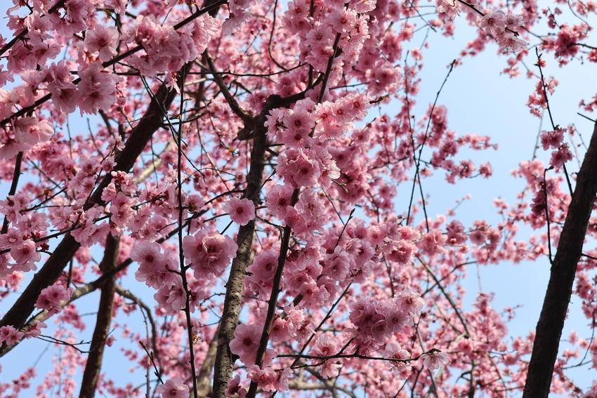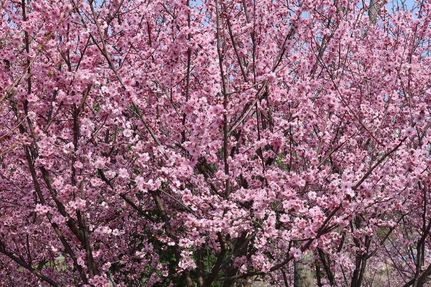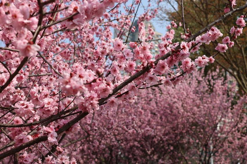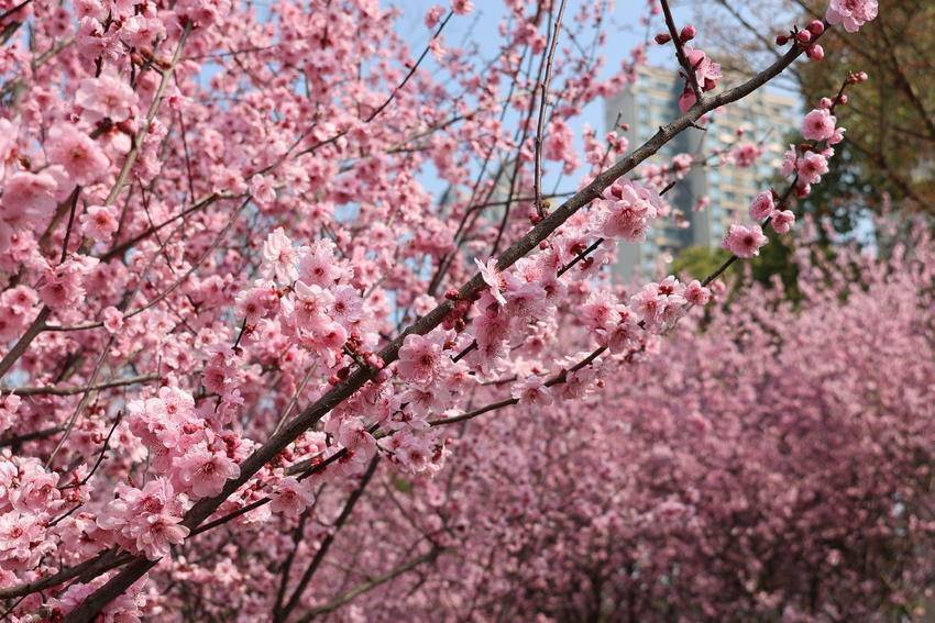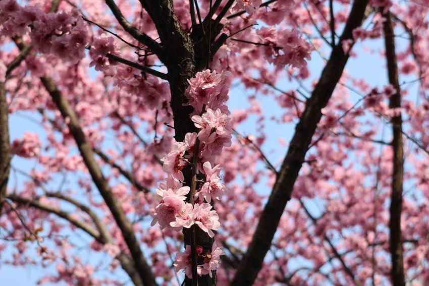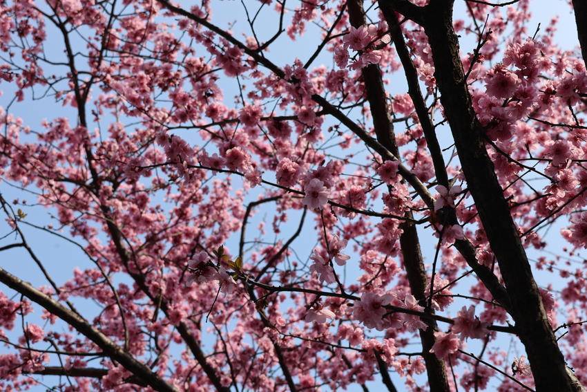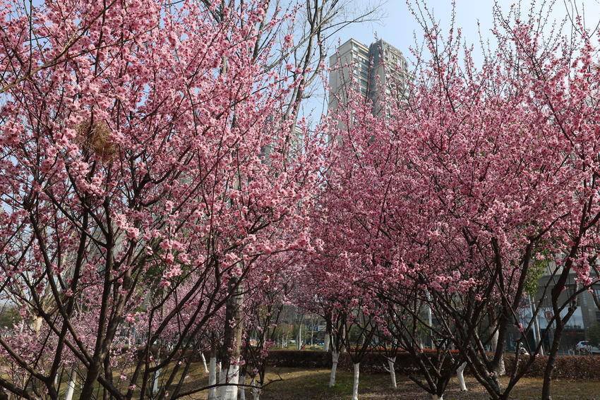 枝头繁花次第绽放,粉白相间、姹紫嫣红,与碧水蓝天相映成画。