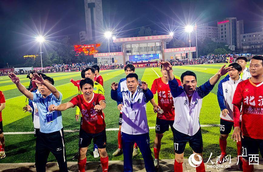 比赛结束后,北流市、岑溪市两队球员向主场球迷致意。人民网记者 付华周摄