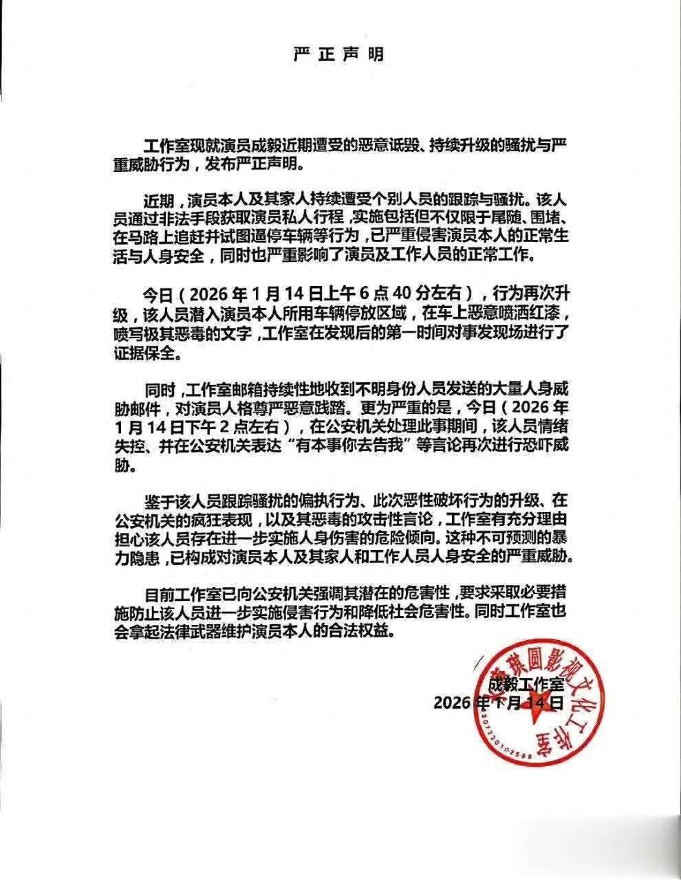 我坚信,这一系列看似平常的举动必定经过了精心策划,背后很难说不存在团队操控。当成毅的私人生活遭到非法窥探,人身安全面临赤裸裸的威胁,其车辆被喷红漆、马路被逼停,这一事件不仅是对一位优秀演员的伤害,更是对法治与公序良俗的公然挑衅。抛开演员身份不谈,成毅作为中华人民共和国的合法公民,积极纳税,还多次低调地向各灾区捐款,这样充满正能量的人不应遭受如此对待!